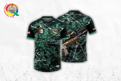 Dengan desain kamuflase hijau-hitam, logo QSC, Perbakin, dan gambar senapan sniper, ideal untuk menunjukkan profesionalisme dalam menembak.