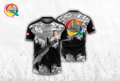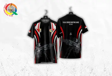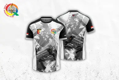 Desain putih-hitam dengan corak abu-abu dan gambar pistol, lengkap dengan logo QSC, Perbakin, dan bendera Indonesia—sempurna untuk atlet dan penggemar menembak.