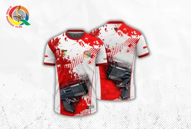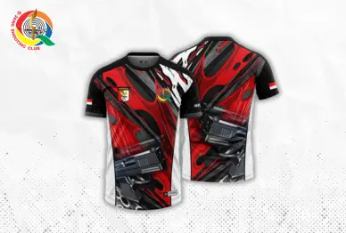Dengan dasar putih dan corak merah, menampilkan gambar pistol di depan dan belakang. Dilengkapi logo QSC, Perbakin, dan bendera Indonesia, ideal untuk penggemar dan atlet menembak.