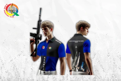 Kamuflase putih-abu di dada dan punggung, berlatar hitam untuk tampilan profesional. Ideal untuk atlet menembak yang mengutamakan gaya dan fungsionalitas.